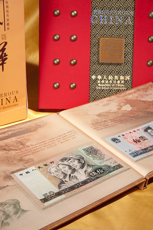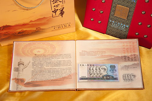 全真丝绸珍藏版钱币册《盛世中华》完整收录了第四套人民币中1元、2元、5元、10元、50元和100元六种主币,以及1角、2角和5角三种辅币,共九种主辅币。该珍藏册以名贵真丝为媒质,以第四套人民币为基点,以各种币面上展现的祖国名山大川为主线,通对风景名胜和各个币种的简介,将浓缩在钱币上的锦绣中华展现得美轮美奂。2011年是中国共产党建党90周年的重大纪年,因而本册在编排的过程中,还特别精选了毛泽东、叶剑英、陈毅等多位共和国开国元勋的手书诗词作为点睛之笔,与各个景点一一对应,不仅展示了一代伟人天才迸发的诗篇咏唱,更展现了老一辈共产党人震铄古今的豪情壮志。本册将气势宏伟的诗篇和珍贵稀有的钱币融入典雅华贵的丝绸,艺术化地集结成一款气韵生动的饕餮大餐,向党的90岁生日隆重献礼。