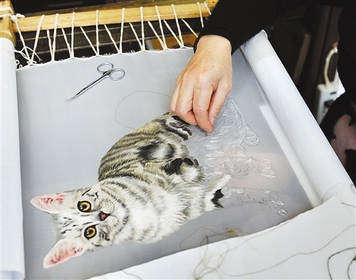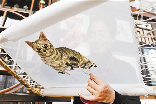 是什么让学生们知难而退?近日,记者在“渝康宁蜀绣庄”内,目睹了康宁的现场操作:在一张正面画着猫、反面画着狗的绸纱上,康宁将两根穿着不同丝线的针来回穿刺。灵巧的指尖,就像在绸纱上跳“芭蕾”。5分钟后,绸纱上,猫儿和狗儿的毛色已渐渐发亮。