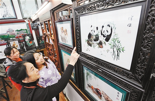 ▲康宁正在向慕名而来的客人介绍蜀绣作品。